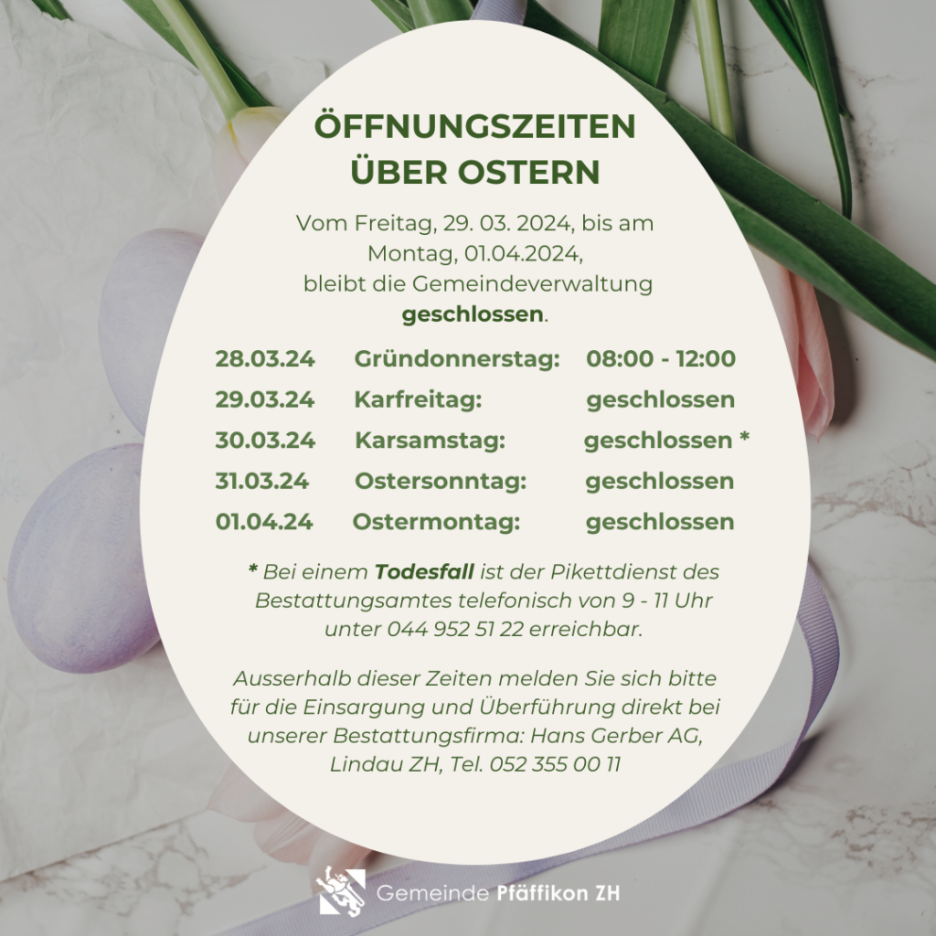 Ausserhalb dieser Zeiten melden Sie sich bitte für die Einsargung und Überführung direkt bei unserer Bestattungsfirma: Hans Gerber AG, Lindau ZH, Tel. 052 355 00 11