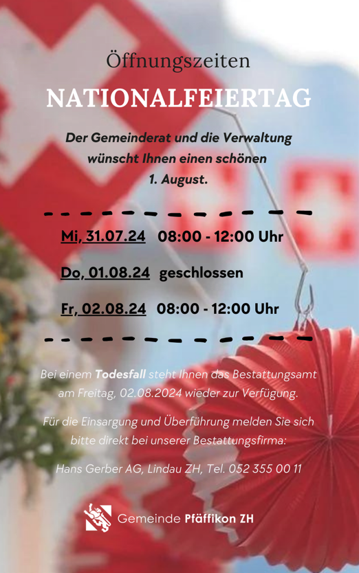 Aufgrund des Nationalfeiertages am 1. August gelten für die Gemeindeverwaltung folgende Öffnungszeiten: