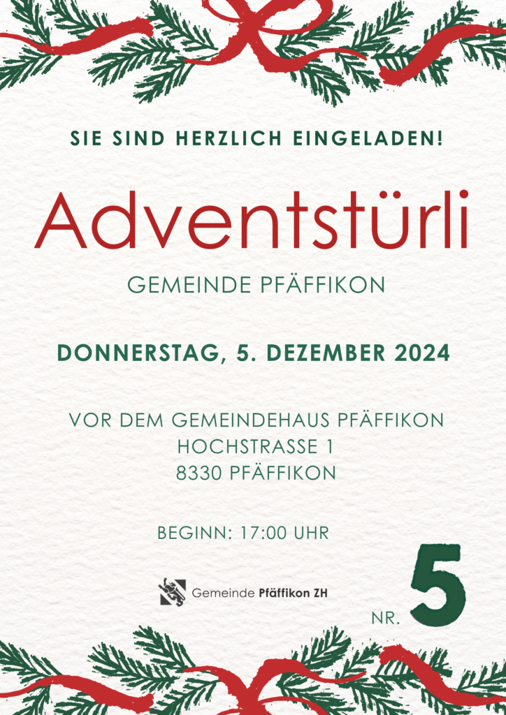 Die Gemeindeverwaltung ist das Adventstürli Nummer 5 und wir freuen uns dieses gemeinsam mit Ihnen am Donnerstag, 5 Dezember 2024 einzuweihen. Freuen Sie sich auf leckeren Lebkuchen, feine Guetzli und ein gemeinsames Anstossen in festlicher Atmosphäre. Kommen Sie vorbei. Wir freuen uns auf Ihre Teilnahme.