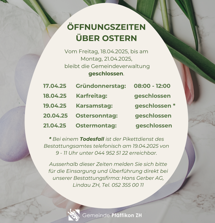 Ausserhalb dieser Zeiten melden Sie sich bitte für die Einsargung und Überführung direkt bei unserer Bestattungsfirma: Hans Gerber AG, Lindau ZH, Tel. 052 355 00 11