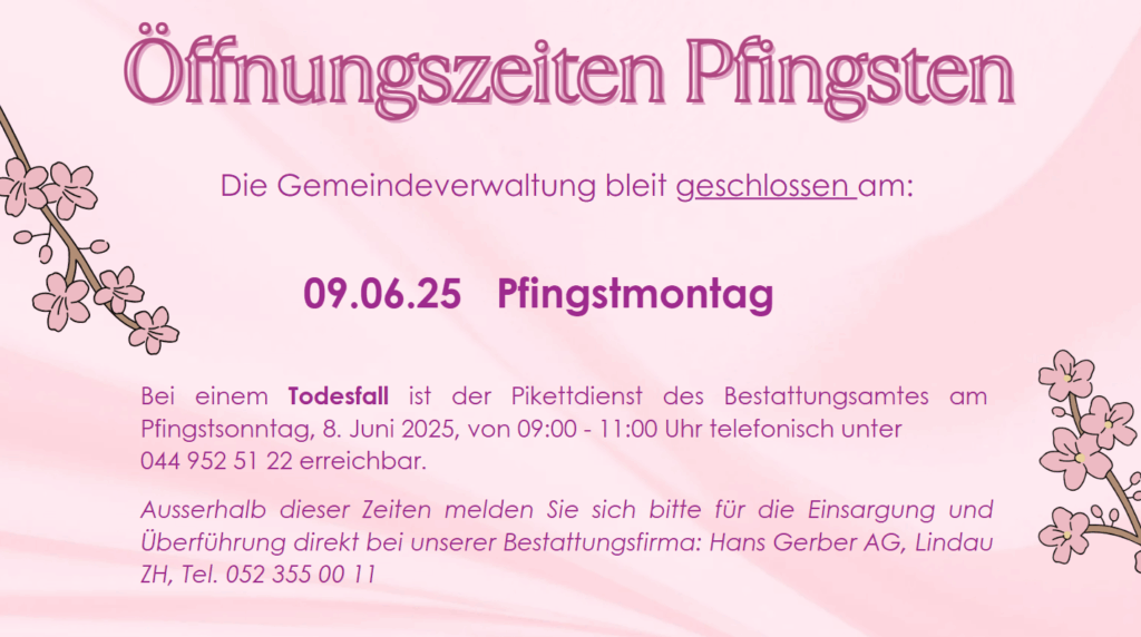 Öffnungszeiten der Gemeindeverwaltung über Pfingsten 2025