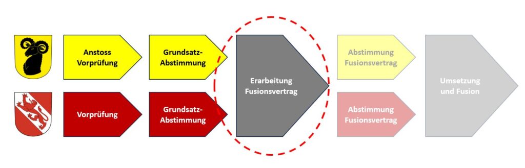 Über den erarbeiteten Fusionsvertrag wird in beiden Gemeinden gleichzeitig abgestimmt werden. Stimmen in diesen Abstimmungen beide Gemeinden zu, wird die Fusion umgesetzt. Wird die Vorlage von einer oder beiden Gemeinden abgelehnt, kommt die Fusion nicht zustande.